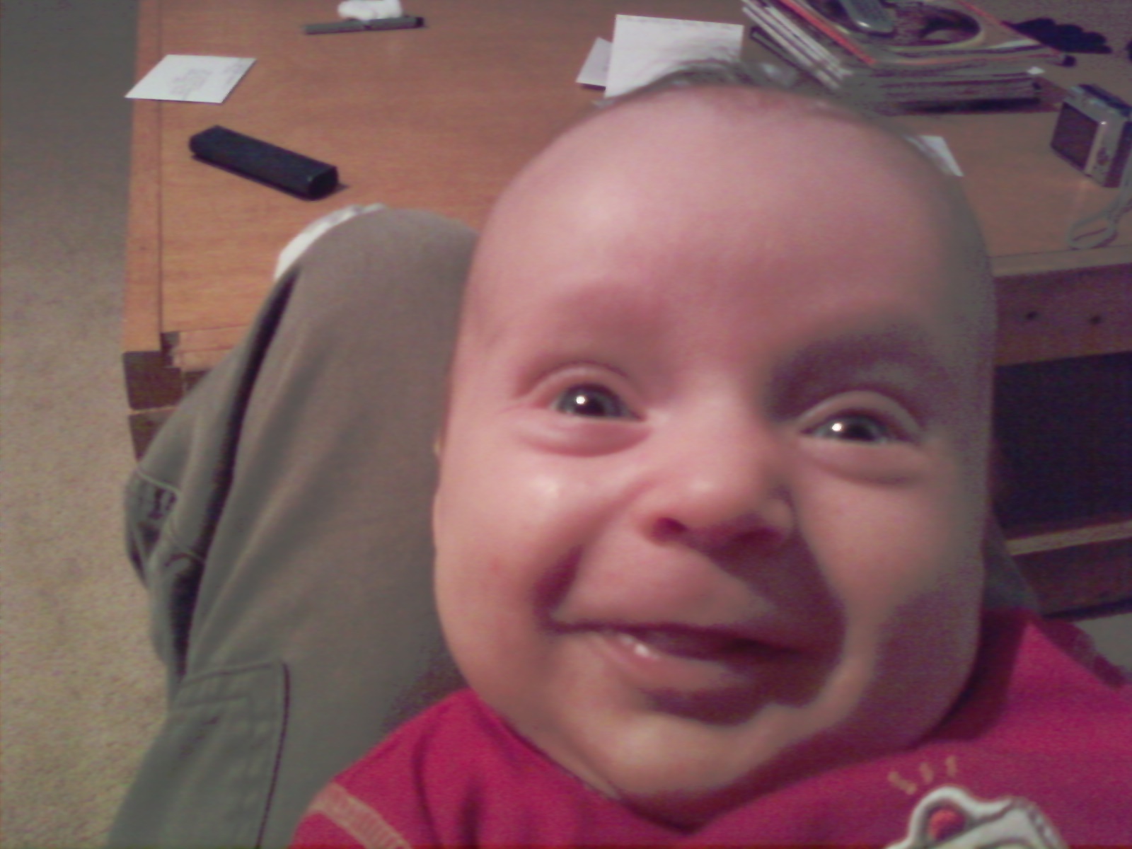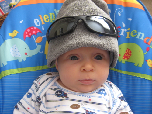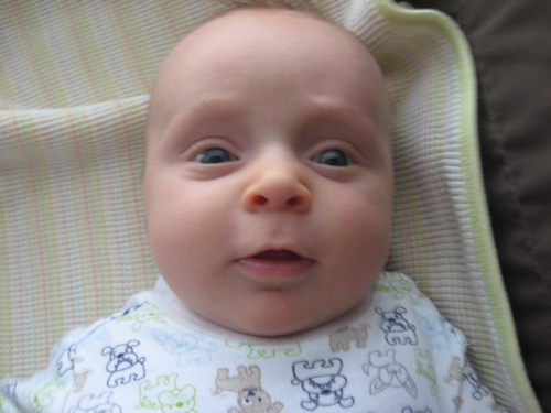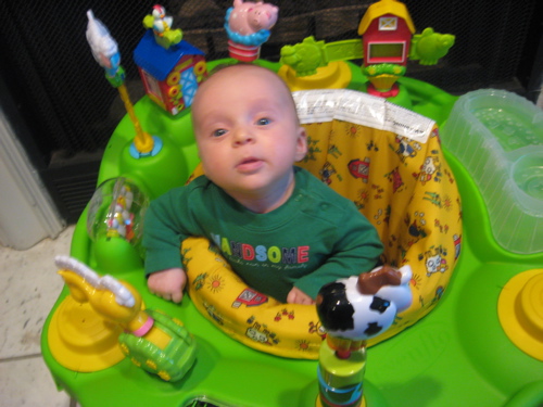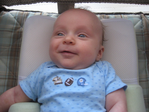 His new things lately are: Â waking up pretty consistently at 6:00 am every morning with a big smile on his face…flirting with the sunlight, kickboxing, and vocalizing in twenty different expressive ways; averaging anywhere from five to eight hours of sleep at a stretch at night; shoving his little fists in his newly drooling mouth; staring at his hands (he just started doing that today); protesting tummy time and coming awfully close to rolling over onto his back in the process; talking to the baby he sees in the mirror on his bouncy seat; laughing at his Mommy and Daddy in their fumbling attempts at teaching him sign language; and delighting in his farm animal musical mobile.